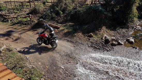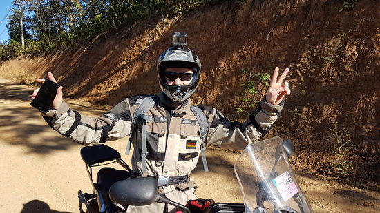 Daniel erbarmt sich und winkt ihn zu sich auf den Sozius, beim Anfahren scheppert sein Kopf nochmal von hinten gegen Daniels Helm und weiter geht der Ritt durch die Berge mit seinem Beifahrer in Flipflops und quietschend vor Freude und Fahrspaß mal auf einem richtigen Motorrad mitfahren zu können. Witzig…