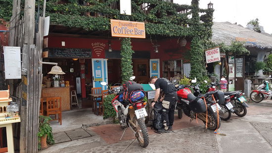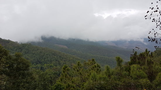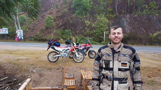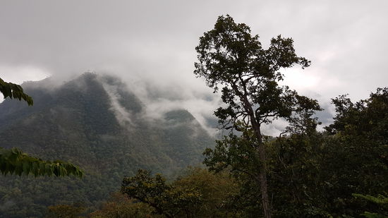 Als wir uns noch schnell um kurz nach 8 eine Kaffee gönnten, war es noch trocken. Doch nach den ersten 5km in die Hügel setzte der Nieselregen ein. Ich hasse es bei nasser Fahrbahn kurven fahren zu müssen, aber so ist das nun mal. Im Verlauf hört es sogar mal wieder auf und auch die Fahrbahn ist für 100km fast trocken. Die Krönung kommt dann vor dem Doi Inthanon, der Höchste Berg Thailands mit 2565 Metern, hier hat sich quasi ein Wolkenschwamm angesammelt und bleibt am Berg hängen. Es regnet wie aus Eimern und kalt ist es noch zusätzlich.