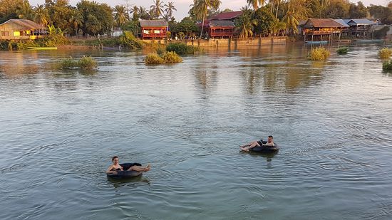 Am Nachmittag schaffe ich es mich maximal passiv beim Tubing durch den Mekong treiben zu lassen. Die Tour ist bis auf die schöne Sonne und der etwas stärkeren Strömung im Vergleich zu Vang Vieng ähnlich schlecht im Preisleistungsverhälnis (7€).