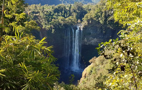 Der erste Wasserfall Nam Tok Katamtok nach unserem Aufbruch vor 25km ist der höchste der Region, hier stürzt das Wasser 100 Meter in die Tiefe. Da hier heute beim Frühstück einige Gespräche unter den anderen Reisenden gelaufen sind, dass Touristen auf dem 40min. Fußweg vom Wasserfallparkplatz zum Wasserfall überfallen wurden, sparen wir uns den Fußweg und fotographieren ihn nur aus der Ferne.