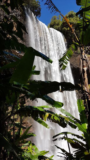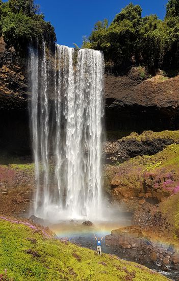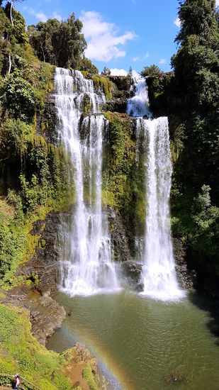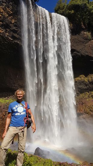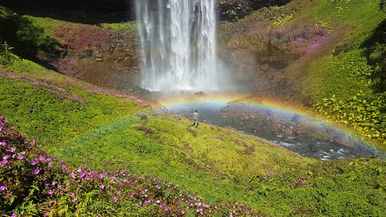 Durch die einfallende Sonne und den entstehenden Sprühnebel entwickelt sich ein Regenbogen in feinster Form, die Wassermassen stürzten wie ein Vorhang 80 Meter in die Tiefe und alles auf dieser Lichtung ist satt grün und tausende von kleinen Blumen malen mit ihren Blüten ein Farbenmeer. Ein Anblick der ans Paradies erinnert… unglaublich.