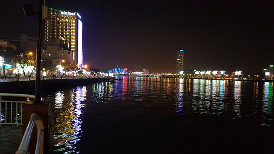 Zum Abschlussbier setzen wir uns nochmal in eine nette Bar an der Uferpromenade und genießen den Ausblick auf den bunt beleuchteten Fluss.