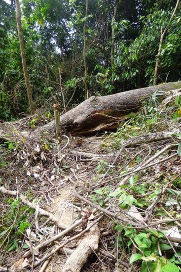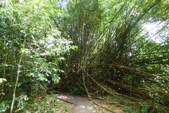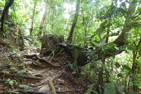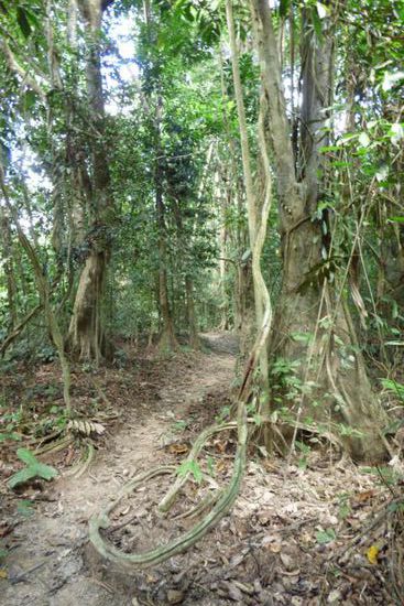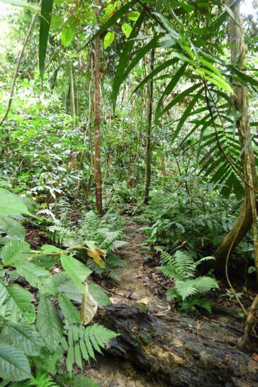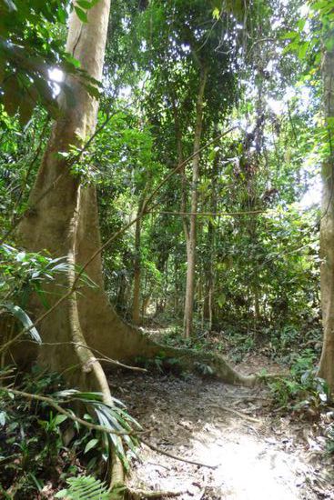 Die befestigten Wege endeten auch ziemlich schnell nach der Abzweigung zum Canopywalk und dann musste ich mich den kompletten Weg durch den Wald „kämpfen“. Und auch diesmal gab es keine Ausschilderung mehr – allenfalls die schon bekannten kleinen gelben Wegweiser an den Bäumen – und auch der Weg war inmitten der Pflanzen kaum mehr als ein Trampelpfad und teilweise schwer zu erkennen.