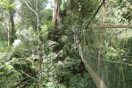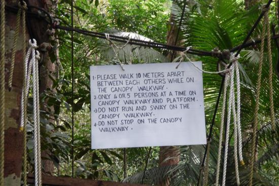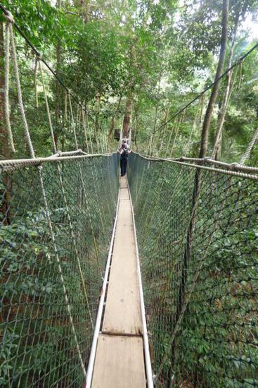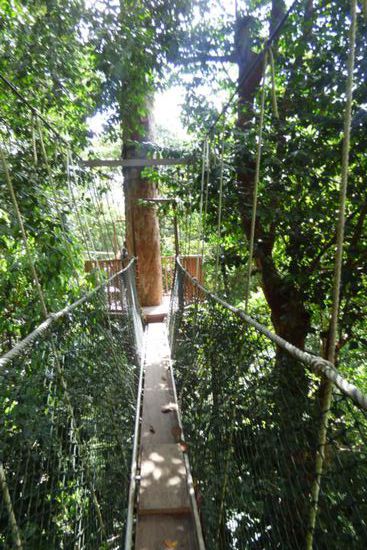 Dort half mir mein Eintrittsticket wenig, denn für das Betreten der Hängebrücke bezahlte ich noch einmal 5 RM. Die etlichen Brücken hängen zwischen 25 und 45 Metern in den Baumwipfeln und es ist ein Erlebnis über schwankenden schmalen Stege zu schreiten. Glücklicherweise war nicht allzu viel los und so staute es sich auf den kleinen „Inseln“ zwischen den einzelnen Abschnitten auch nicht allzu sehr. Wobei ohnehin nicht mehr als 4-5 Personen zeitgleich auf den Brücken laufen dürfen. Leider war nicht der vollständige Canopywalk geöffnet – einen Teil konnten wir nicht betreten, was sehr schade war. Dennoch hat es Spaß gemacht….
