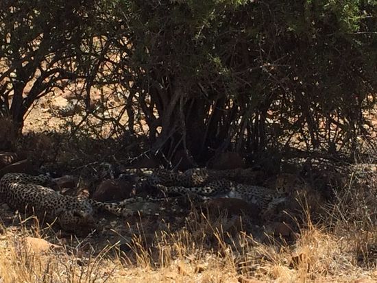 Wir hoppeln weiter durch die Landschaft. Von Zeit zu Zeit kommt die Antenne zum Einsatz. Es rauscht weiterhin. Irgendwann halten wir und unser Antennenmann schreitet zum Äußersten. Er klettert nebst technischen Equipment auf die Motorhaube um eine erhöhte Position zu bekommen. Und siehe da, aus dem Geräusche entwickelt sich ein Signal. Nur ist man sich noch nicht ganz schlüssig, aus welcher Richtung es kommt. Shawn meint, er hätte 2 verschiedene Geparden geortet, schaut aber nicht wirklich zufrieden. Wir fahren weiter. Immer wieder wird die Signalstärke kontrolliert. Schließlich stoppt er den Wagen, bedeutet uns auszusteigen und zeigt unbestimmt den Berg rauf. Halleluja. Ich ahne schlimmes. Mittlerweile ist es ordentlich warm geworden. Für uns heißt es jetzt durch unwegsames Gelände in einem Affenzahn den Berg hoch. Nach 5 Minuten schwitze ich, nach 10 Minuten japse ich nach Luft und nach einer halben Stunde sind mir die Cheetah's herzlich egal. Ich hab keinen Bock mehr. Shawn schaut immer wieder prüfend durch sein Fernglas und endlich kommt die erlösende Meldung: dort oben unter dem Busch. Ich habe einen Kopf gesehen. Ok, die letzten Meter schaffe ich nun auch noch. Und dann ist es egal. Alle Mühsal ist vergessen. Ich starre verzückt auf Mama Cheetah und ihre drei Jungtiere. 4Katzenköpfe schauen uns träge an, recken und strecken sich und suchen nach einer neuen, noch bequemeren Schlafposition. Kaum zu fassen, wir stehen mitten in der Walachei, keine 10 Meter von 4 Geparden entfernt. Ein unglaubliches Erlebnis. Ca. 20 Minuten bleiben wir bei den Vieren, dann machen wir uns auf den Abstieg. Ein wirklich toller Moment geht vorüber.
