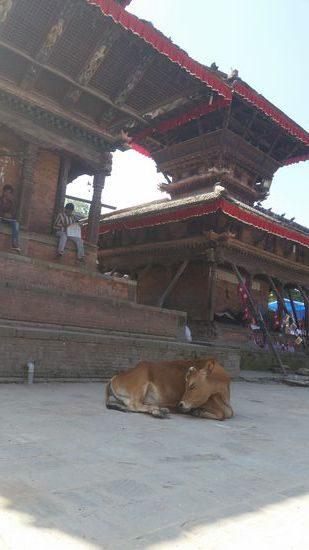 Am Durbar Square gibt es unzählige Tempel und historische Gebäude. Leider ist vieles nicht besonders gut in Schuss, wobei wir nicht erkennen konnten, ob das mit dem großen Erdbeben von 2015 zusammenhing oder einfach kein Geld da ist. Ansonsten haben wir dort die ersten Kühe in der Stadt rumlaufen sehen.