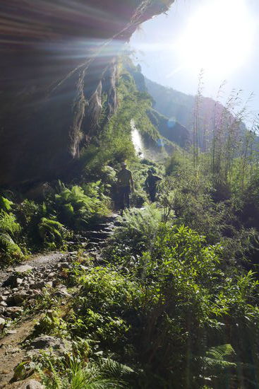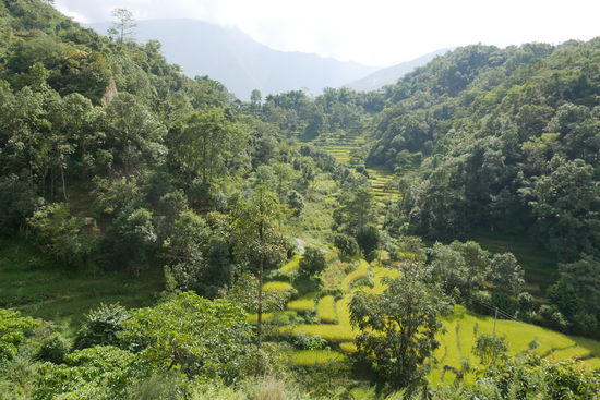 An den ersten beiden Tagen waren es die schwülheißen Temperaturen, die uns den Schweiß aus allen Poren trieben. Durch wunderschöne, sattgrüne Landschaften sind wir stetig weiter aufgestiegen. Ab dem dritten Tag waren die Temperaturen deutlich angenehmer und es ging immer weiter mehr oder weniger sachte bergauf. Wir haben uns die ganze Wanderung darüber amüsiert, wenn unser Guide so was gesagt hat wie „almost flat“ oder „slightly up“. Almost flat gibt es im Himalaya nicht! Und slightly up, naja, das vielleicht schon, aber wie soll ich es beschreiben? Also nicht das, wie wir es verstehen und ab einer gewissen Höhe merkt man eh jedes Grad an Steigung.