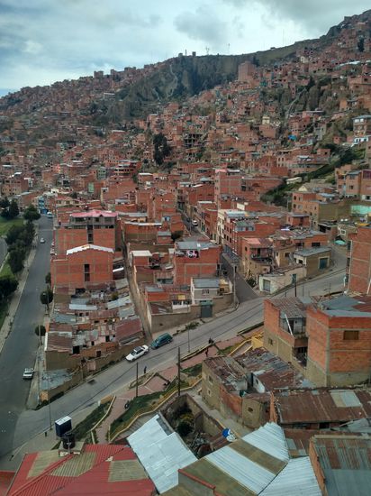 Mit zwei Seilbahnen hintereinander schwebten wir über die Dächer von La Paz hinauf nach El Alto. Der Stadtteil liegt auf dem Altiplano und man hat tolle Ausblicke.