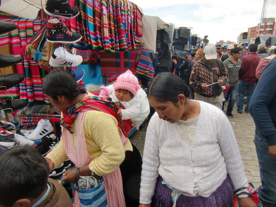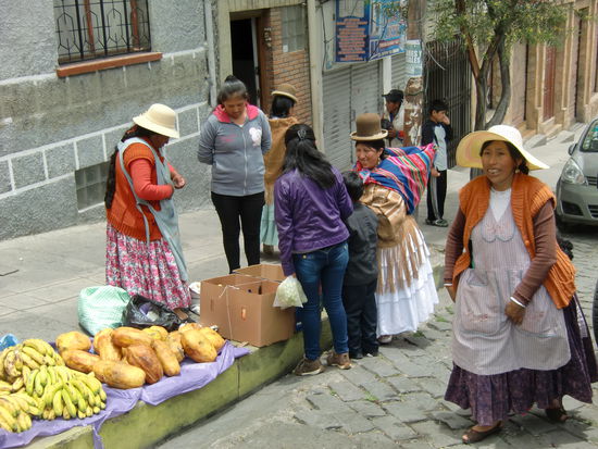 Riesiger Markt. Wir konnten einige Frauen in der bolivianischen Tracht ablichten. Sie tragen viele Röcke über einander und haben diese komische Melone auf dem Kopf.