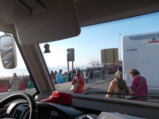 14.1. Abfahrt der Gruppe um 6.45 Uhr zur Fähre nach Ceuta. Bestimmt hundert Wohnmobile stehen an um nach Marokko zu kommen. Der Betrieb ist ungeheuer. Doch nichts gegen die Grenze nach Marokko in Ceuta. Eigentlich dachte ich, hier wäre ein Flüchtlingslager, doch es wären nur ganz normale Grenzgänger und der Betrieb wäre heute eher mäßig. Wir schlängeln im Konvoi durch die Menschenmenge, immer in der Hoffnung, nicht doch irgendjemand unter den Rädern zu haben. Der Pass-Stempler an der Grenze glänzt durch Abwesenheit, aber nicht lange, nur ein Stündchen. Bis dahin geht gar nix. Dann geht es endlich ein paar Schritte weiter zur Fahrzeug Kontrolle. Ellenlange Listen und Zettel müssen ausgefüllt werden. Nach fünf Metern kontrolliert einer, ob auch alle Stempel in den Pässen sind, weitere fünf Meter kontrolliert einer, ob auch die Papiere fürs Womo okay sind, fünf Meter weiter prüft ein Uniformierter ob auch wirklich alle Papiere ordentliche Stempel haben. Dazwischen betteln etliche Herren um eine kleine Gabe für Allah. Das muss ein ziemlich armer Mann sein… Kurz vor Mittag haben wir’s geschafft. Wäre sensationell schnell gewesen, sagt Uwe, unser Reiseführer. Wunderschön die Stadt Tetouan, die wir dann durch gepflegte Anlagen und eine Laternen-Palmen-Allee durchfahren. Sauber, weiß, hellblau, Meister Proper hätte seine Freude daran, oder doch eher der Weiße Riese?? Der berberische Name der Stadt bedeutet wörtlich „Augen“. Sie hat auch den poetischen Beinamen „Die weiße Taube“ (französisch La Colombe blanche).