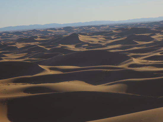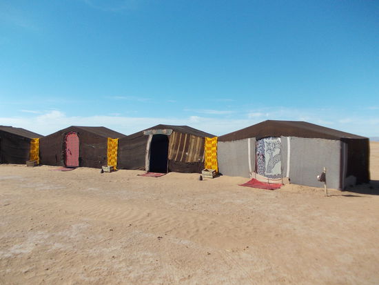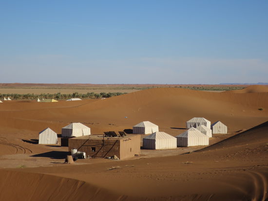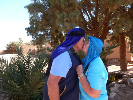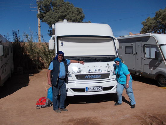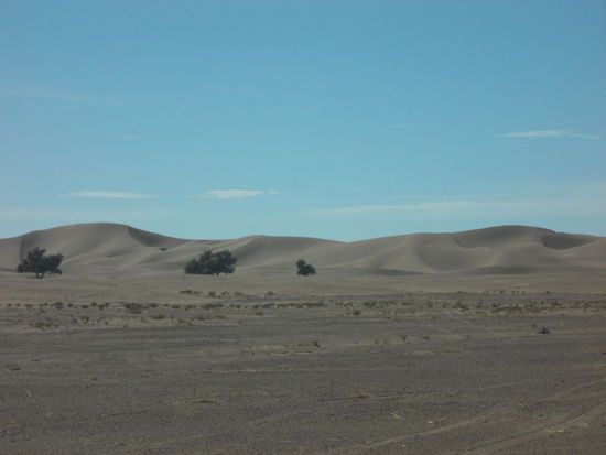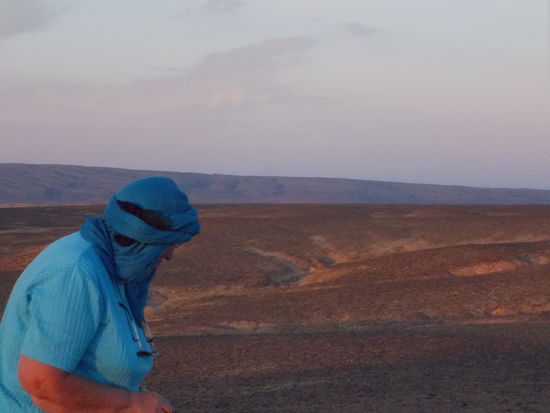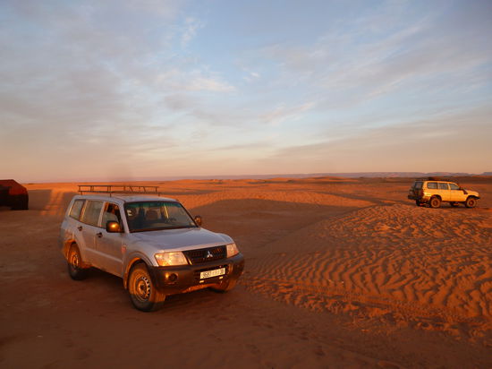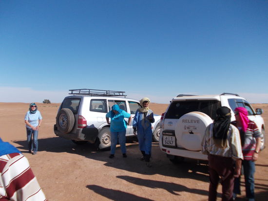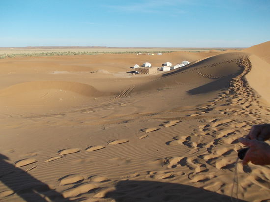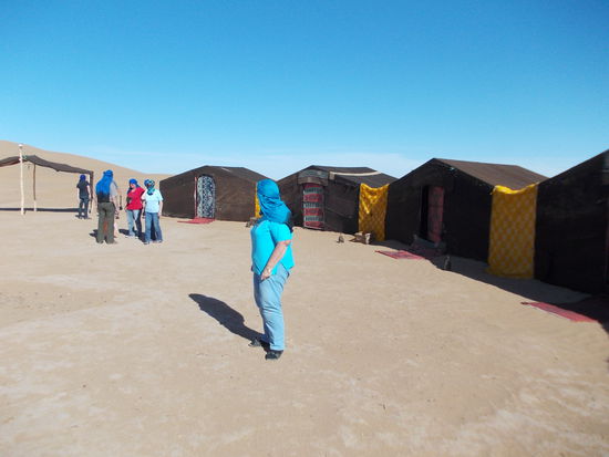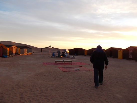 Nach einem Kurs für Wickeltechnik des Turban, der hier natürlich anders heißt, düsen wir los. Unser Fahrer ist ein lustiger kleiner Kerl, mit grauenhaften Zähnen. Sein Nissan-Geländewagen sieht genauso aus. Noch hat es hier ein wenig Vegetation und Sand, dann erreichen wir eine kahle Steinwüste. Das Auto hoppelt, klappert, wackelt, rattert über die Steine, bis wir endlich Sanddünen erreichen. Hier geht es schlingernd und schaukelnd, wie ein Schiff in hohem Seegang, weiter bis zu einem Camp. Eigentlich sollten wir hier Tee bekommen, aber irgendwas hat nicht geklappt, also hoppeln wir weiter bis zu einer dreihundert Meter hohen Sanddüne. Ganz Tapfere erklimmen sie auch. Einen Schritt vor, zwei Schritte rutscht man zurück. Ich gebe bereits nach der ersten hohen Düne auf. Die Mutigen, die es ganz nach oben geschafft haben, erwarten sogar den Sonnenuntergang. Zurück im Camp erhalten wir unser „Zelt“ für die Nacht. Zelt ist geprahlt. Ein Stück bunter Stoff über einem selbstgezimmerten Gestell. Immerhin hat es elektrisches Licht und ist mit Teppichen ausgelegt. Die Bettstatt ist eine Matratze, ich denke mit Kamelhaar gefüllt, auf der Erde, hart wie Beton. Die Kissen? Garantiert mit Sand gefüllt. Beton ist weich.