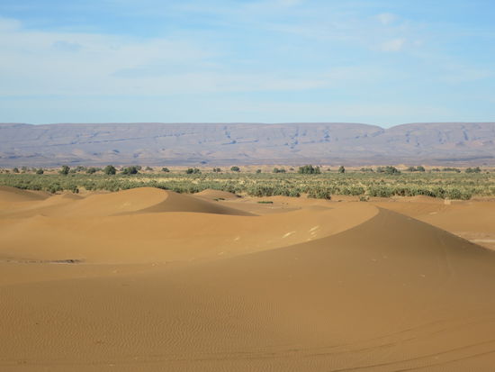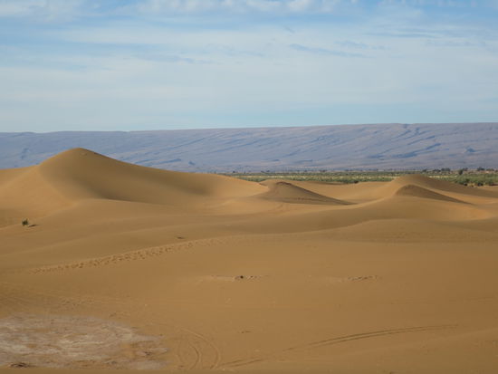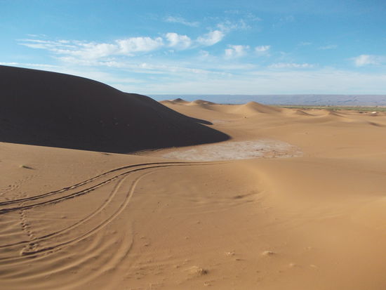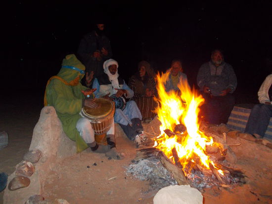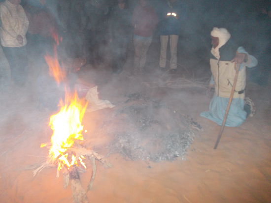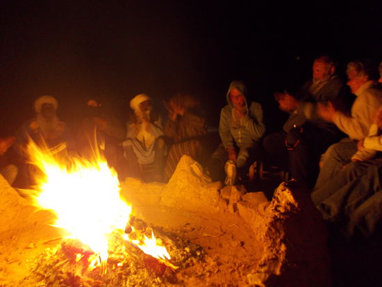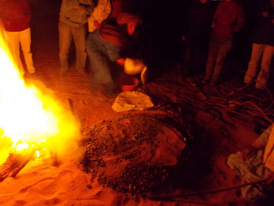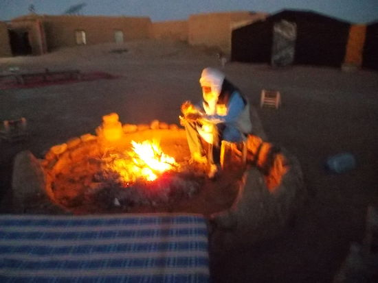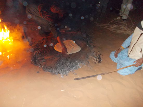 Unsere Helfer, Araber übrigens, keine Berber, bewirten uns mit Tee, Oliven, Erdnüssen und Keksen, die verdächtig nach Bahlsen Butterkeks schmecken. Dann werden Lagerfeuer entzündet. Alle warten abgekämpft aufs Abendbrot, doch das muss erst noch gebacken werden. Dafür wird ein Sandhaufen mit Holz erhitzt, zur Seite gescharrt, der Teigfladen kommt rein, der heiße Sand obendrüber und dann heißt es geduldig warten. Nach einiger Zeit wird der Fladen ausgegraben, umgedreht und die Prozedur beginnt von vorne. „Wenn Brot gut“, sagt der Junge, “ dann Essen fertig.“ Und so ist es. Es gibt die marokkanische Suppe, sehr lecker, Tajine mit Hühnchen und anschließend Obst.