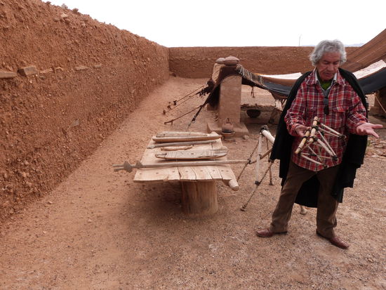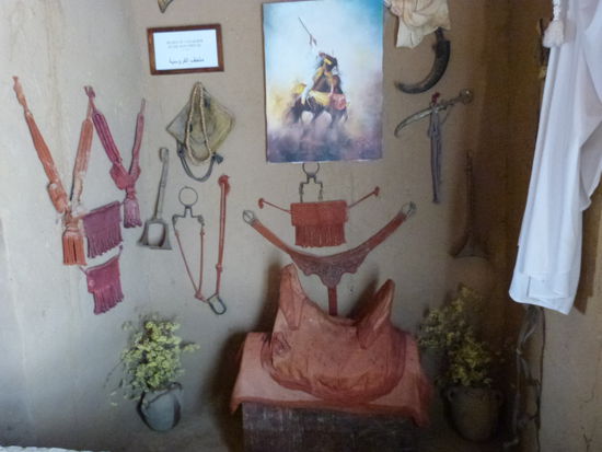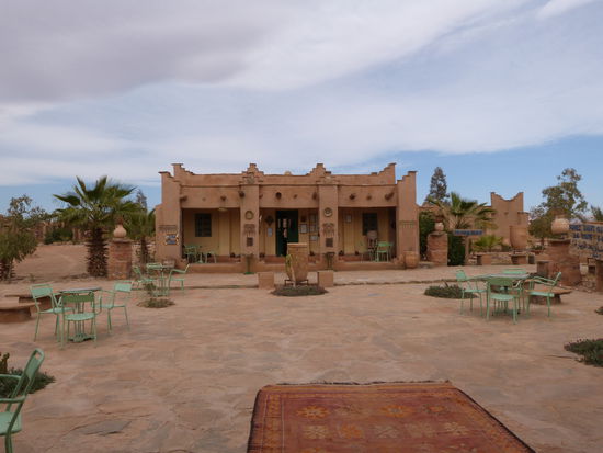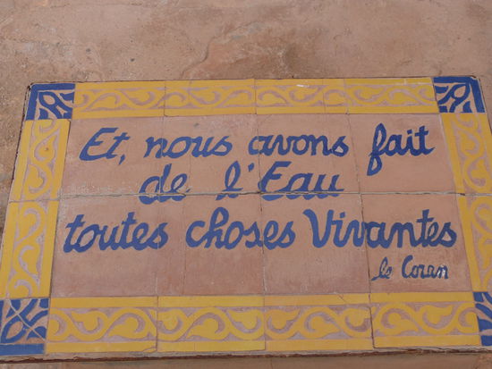 Die Todra-Schlucht stände bei uns garantiert unter Naturschutz. Eine recht ordentliche Straße bringt uns tief zwischen die riesigen Felsen. Ein Bächlein plätschert lustig über Kiesbänke und bringt das Tal zum Ergrünen, wenn es den Felsen entronnen ist. Weiter durch karge trockene Gebiete, zugemüllt mit bunten Plastiktüten, was für ein Jammer. Einige langgezogene staubige Dörfer, dann taucht zu unserer Linken eine ungewöhnlich anmutende Ansammlung von kleinen Häuschen auf. Zaid, ein Künstler hat an diesem staubigen Platz in der Einöde ein kleines Paradies geschaffen. Drei Quellen hat er erschlossen, leider sind alle salzig. Trotzdem gelingt es ihm Blumen in einem zauberhaften Garten zu bewässern. Er ist ein Sammler und hat die Passion vorbeikommenden Touristen die Kultur von Berbern, Nomaden und Arabern nahezubringen. Er sammelt alles was es über die Kultur seines Volkes zu wissen gibt. Und er macht wunderschöne Kalligraphie. Zaid hat in Heidelberg studiert und spricht hervorragend deutsch. Seine Liebe gehört auch dem „Kleinen Prinzen“. Die Weisheiten aus diesem Buch hat er in viele Sprache übersetzt und in Tafeln in seinem Freilichtmuseum verewigt.