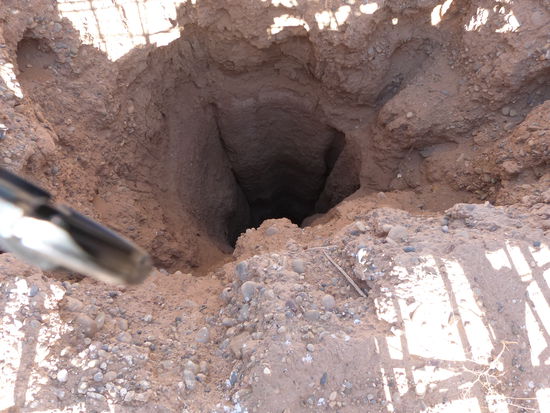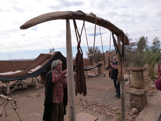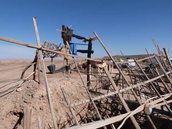 Unsere Belehrung ist an diesem Tag noch nicht beendet. Wir erreichen den Wasserbrunnen. Hier haben vor gut 100 Jahren viele Familien gigantische Löcher in die Erde gebohrt und sie unterirdisch mit einander verbunden, so ist es ihnen gelungen Wasser aus einer unterirdischen Quelle zu einer Oase zu bringen. Heute gibt es eine Wasserleitung und die Überreste der Wasserbrunnen sind nur noch erhalten um Touristen zu beglücken.