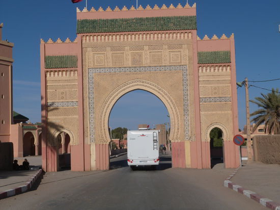 Ein prachtvoll verziertes Tor schmückt den Eingang zu Rissani. Wir schlängeln uns durch die schmalen Straßen der Stadt. Der Verkehr ist unglaublich. Man denkt, dass zurzeit jeder, wirklich jeder mit einem Fahrzeug unterwegs ist. Nicht verwunderlich, denn Sonntags ist der große Markt