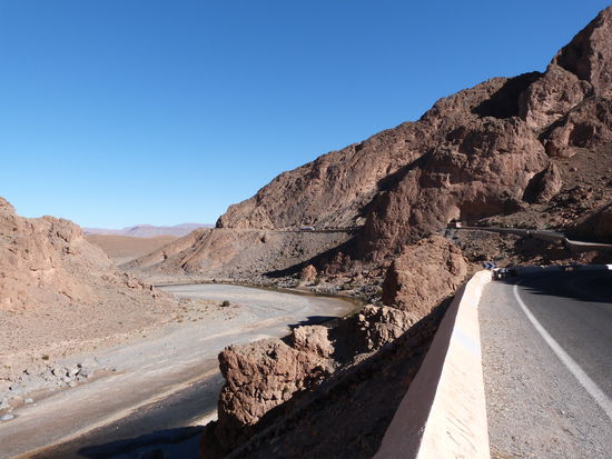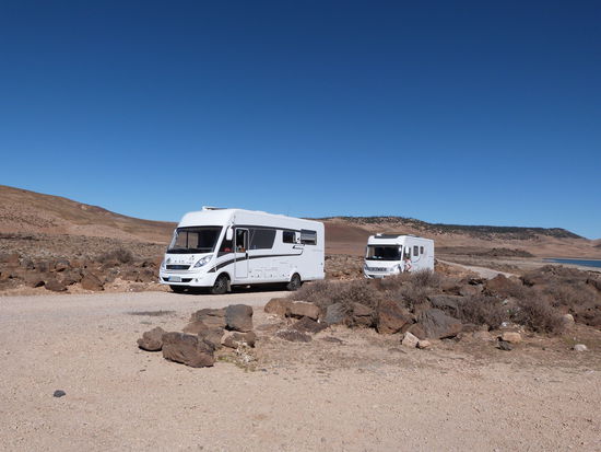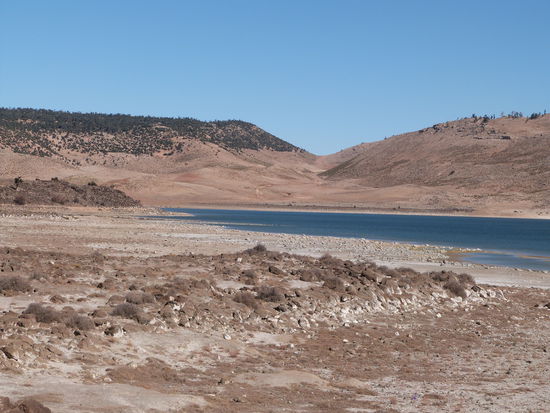 Mit Riesenschritten nähert sich unsere Reise dem Ende zu. Am Barrage de Hassan Abdakhil entlang, durch die Georges du Ziz-Schlucht mit unvergleichlichem Blick auf das Tal und immer Richtung nach oben, durch den Tunnel der Legionäre, über den Hohen Atlas bis zur Hochebene auf 1900 m hoch, dann immer weiter nach Norden. In der Apfelstadt Midelt steht ein Riesenapfel auf einem Kreisel, dann geht es weiter Richtung Fes. Schneebarrieren werden uns bremsen, doch es hat keinen Schnee. Die Sonne brennt lachend auf Berg und Tal. Dann geht es weiter auf den Mittleren, den Moyen Atlas auf 2200 m Höhe. Die bettelnden Hunde am Straßenrand füttern wir mit Brot. Auch an dem großen Stausee Aguelmane de Sidi Ali, der halb leer ist, liegt kein Flöckchen Schnee. Durch einen herrlichen Zedernwald geht es dann zur verwaisten Ski-Station und dem Ski-Gebiet des Königs nach Ifrane, einer blitzsauberen Stadt, immerhin noch auf 1.650 m Höhe und weiter zu unserem Campingplatz. Ein langer Tag. Heute Abend soll es gebackene Forelle geben. Wenigsten müssen wir dann nicht kochen.