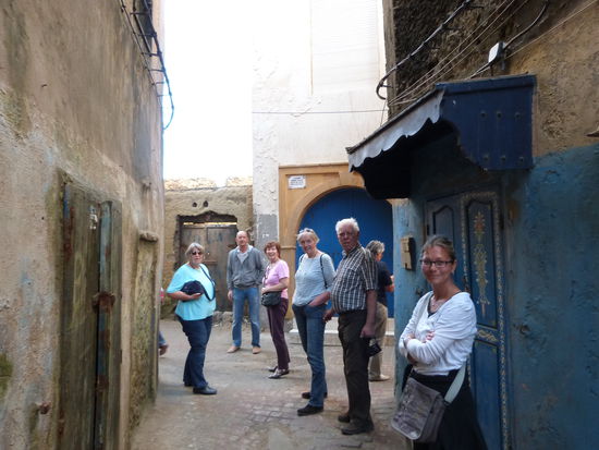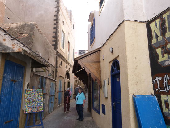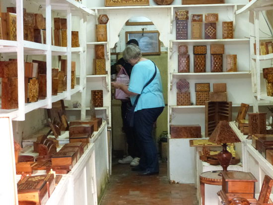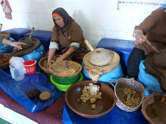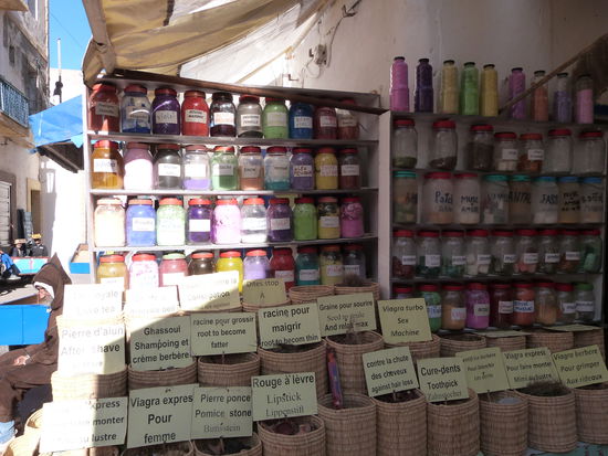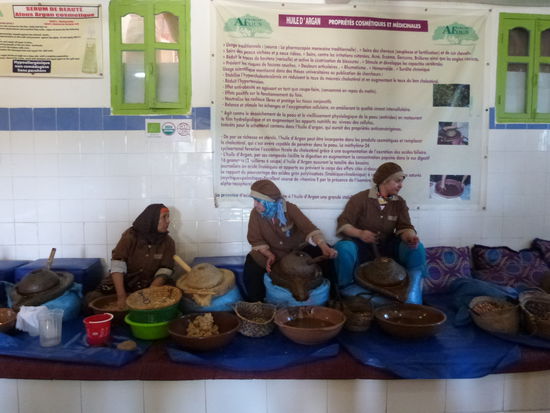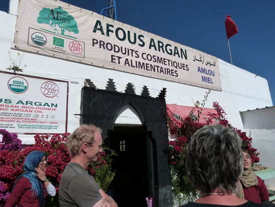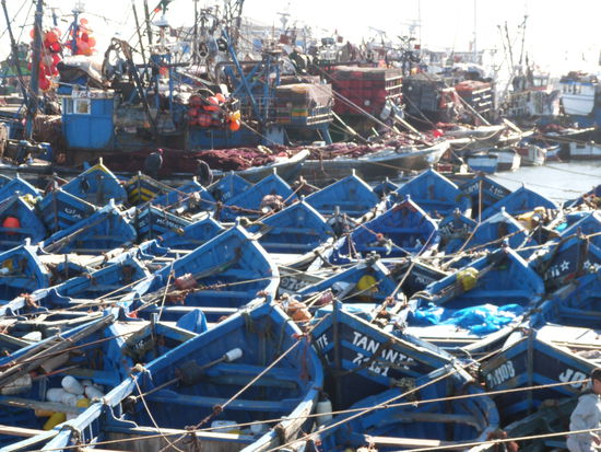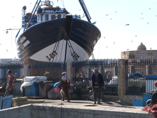 Durch eine pulvertrockene wüstenähnliche Landschaft fahren wir nach Chichaoua, schlängeln uns im Gänsemarsch durch die Stadt, erhalten das immer gleiche Bild, ein bisschen Chaos, viele Menschen auf der Straße, kleine Geschäfte am Straßenrand, wunderschöne Prachtbauten und weiter geht es durch imposante Argan-Wälder Richtung Essaouira. Bei der Femme Cooperative Argane Afous, einer Argan-Öl-Mühle machen wir einen Stopp. Hier wird das Öl noch von Hand von Berberinnen gemahlen. Sie stellen Kosmetik damit her und verkaufen natürlich auch das reine Öl, das einfach köstlich schmeckt. Es gibt auch einen Honig aus Argan-Blüten, der einem vom Hocker haut. Um unseren Nachtplatz zu erreichen fahren wir eine einspurige Straße, damit wir uns schon mal drauf einstellen können, auf was wir uns weiterhin gefasst machen können. Bei Gegenverkehr muss man von der Straße auf den sehr steinigen und ausgefahrenen Randstreifen, der aber auch nicht sehr breit ist. Das arme Auto, die armen Reifen… Der Platz den wir erreichen, sieht auch nicht besser aus. Steine gabs und heute wenig Brot, nicht mal ne Mittagspause, die haben wir mal wieder beim Spazieren gehen durch die Medima von Essaouire verbracht. Sehenswert, die kleinen Gässchen, Überbleibsel der Portugiesischen Herrschaft. Die Stadt ist bekannt für ihre wunderschönen Holzarbeiten. Faszinierend der Hafen.
