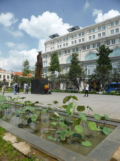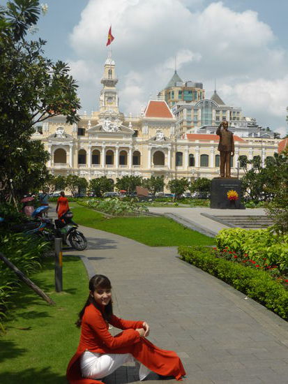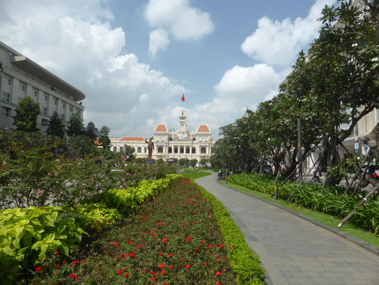 Über die überbreite Straße geht es direkt auf die alte Cityhall zu. Doch zurück zur Cityhall – auf dem Platz vor der Cityhall befindet sich eine sehr gepflegte Grünanlage die umrandet ist von meinen Lieblingsbäumen – Frangipani - und dann ein zwei moderne Einkaufszentren – Vincom-Center und UnionSquare- , in denen sich die ‚Weltmarken’ ein Stelldichein geben. Aber eingekauft wird anscheinend nicht, denn in den Malls herrscht gähnende Leere. (nach Aussage unseres Führers erfahren wir später, dass hier wohl Geld gewaschen wird.) Architektonisch haben sie jedoch einiges zu bieten.
