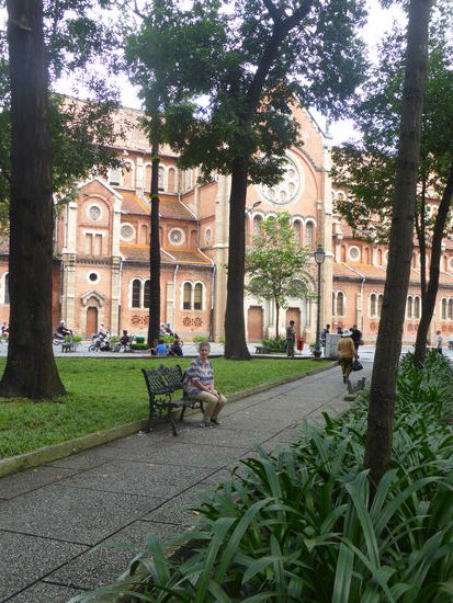 Neben der Kathedrale liegt der kleine aber gepflegte 30-4-Park, der an die Wiedervereinigung Vietnams im Jahre 1975 erinnern soll. Meine Frau Ulrike klagt derweil über ‚Geschlauchtsein’ – immerhin ist es für uns ja eigentlich erst 6. Uhr morgens und so erholsam ist der Flugschlaf auch nicht. Außerdem schafft sie die Hitze und Luftfeuchtigkeit nicht so wie ich. Also suchen wir ein nahegelegenes Restaurant aus, nachdem wir eine kurze Pause auf einer Bank eingelegt haben und ordern Sprudelwasser und grünen Tee. Ulrike ist bald selig im Herrn entschlafen und macht ein kleines Nickerchen, während ich Leute auf der Straße beobachte.