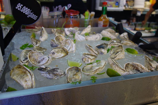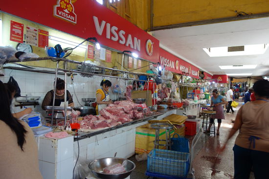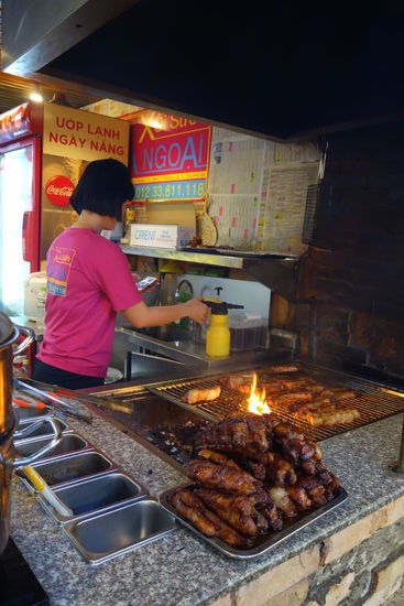 Hier ist wieder einiges los, und im Inneren ist die Luft vom Grillqualm geschwängert; aber es gibt auch Exotisches wie helle Austern (6 Stck – 150000 VND – inzwischen meist als 150K beschriftet – eine sinnvolle Neuerung einfach drei Nullen wegzulassen, denn offenbar gibt es eh keine kleineren als 1000 VND-Scheine. Leider haben wir noch keinen Hunger und verkneifen uns solche Leckereien.