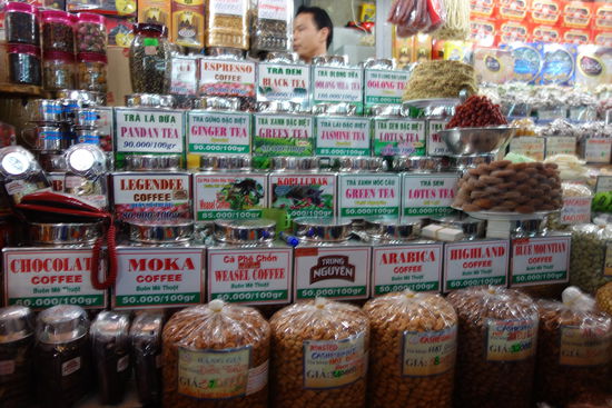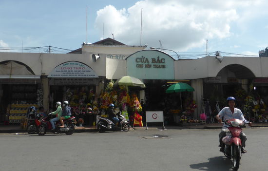 Am Ende der Strasse beginnt dann der riesige Komplex des Ben Than Market, in dem speziell in den Regionen der T-Shirts bereits recht aggressiv geworben wird. (Antatschen ist an der Tagesordnung und ein Hinweis ‚don’t touch me please’ führt nur manchmal zu einer Entschuldigung) Zur Zeit scheint besonders viel Nike-Fake auf dem Markt zu sein. Außerdem fällt mir auf, dass der Kaffee enorm teuer ist – 100g kosten zwischen 50 und 100K! Neu für uns und eigentlich sehr schön sind die auf der Straße angebotenen Faltpostkarten mit Torten, Segelbooten, Kathedrale und anderen Motiven – (3 Stück – 2$). Beim Verlassen des Marktes habe ich etwas die Orientierung verloren, finde sie anhand des markanten Towers jedoch sofort wieder.