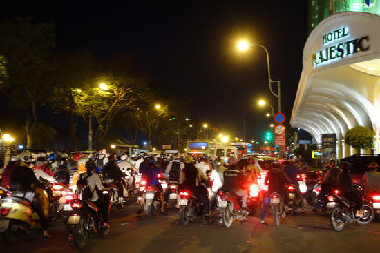 Es folgt eine Stunde Ruhe auf dem Hotelzimmer, ein kühles Bier danach in der happy hour im Bistro und dann zur in Dong Du auf Restaurantbesuch. Nun scheinen inzwischen alle Motorroller unterwegs zu sein, es ist ein unvorstellbares Gewusel.