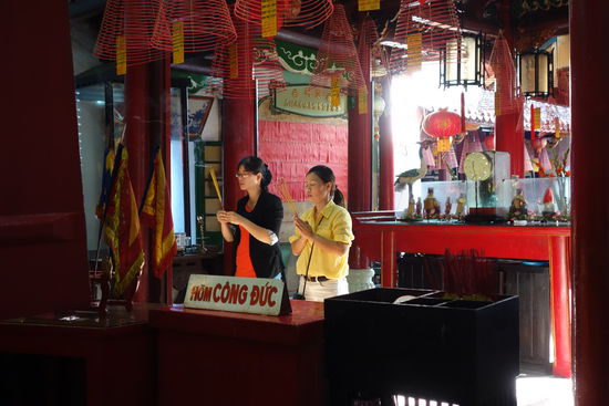 Den Rückweg nehmen wir über die Parallelstraße Tran Phu, an der wir dann zunächst die Versammlungshalle Hou Quan Phuoc Kien besichtigen. Sie geht auf das 1697 zurück. Sie ist reichhaltig ausgestattet und der Seefahrergöttin Thien Hau gewidmet.