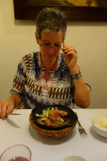 Meine Frau Ulrike ist beim Studium der Karte begeistert, dass es Wein gibt; ich finde, dass die Suppen hier so toll sind, daher bestelle ich zunächst eine Muschelsuppe und danach einen ganzen Fisch mit Tamarindensauce. Ulrike wählt Entenbrust – da passt der Wein – ein franz. SauvignonBlanc - natürlich bestens zu.