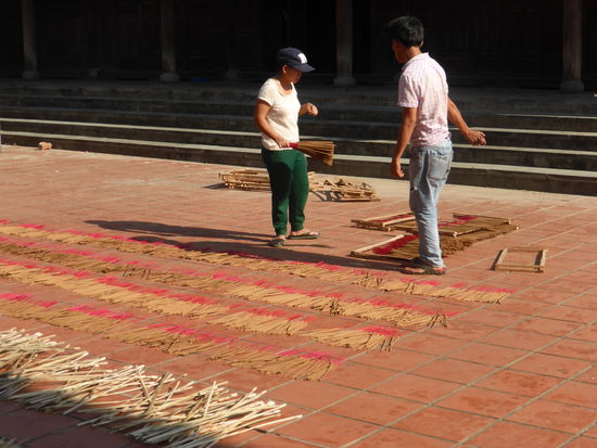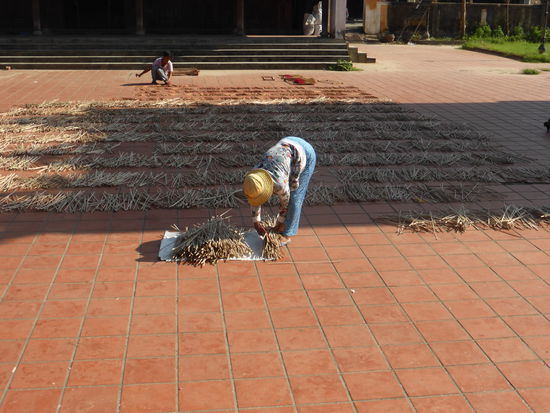 Erst im zweiten Innenhof sehen wir einige der Behinderten, die Räucher-Rohstäbchen und Holzstäbe, aus denen hübsche Laternen geformt werden zum Trocknen auslegen.