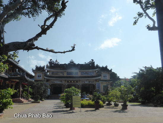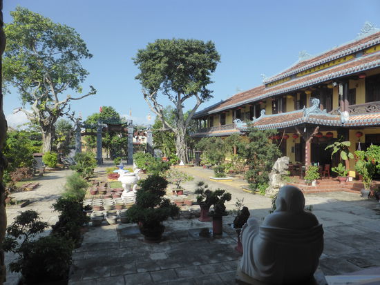 Wir biegen einen Block weiter nach rechts ab und erreichen einen weiteren Tempel Kiến trúc chùa Pháp Bảo eingerahmt zwischen zwei riesigen Bäumen und zahlreichen Bonsaischalen auf dem Hof. Niemand außer uns ist dort, also können wir uns in Ruhe umschauen.