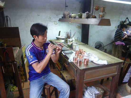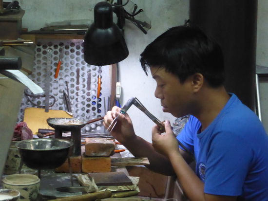 In einer kleinen Werkstatt machen wir noch einen kurzen Stop. Neben Weben und Sticken ist besondes interessant, wie man auf Porzellan Silberverzierungen aufbringt.
