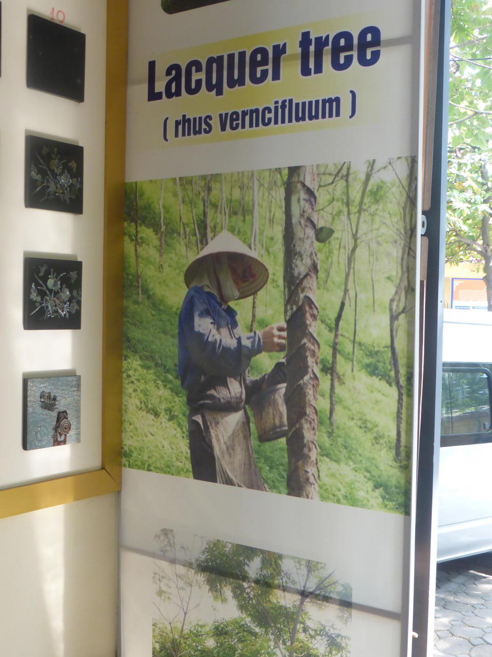 Die Vorführung ist toll, denn wir sehen einen Teil der vielen Schritte zur Herstellung der Lackbilder. Eierschalen, roh und auch geröstet, Muschelschalen, Perlmutt werden eingesetzt. Mit Pinzetten, kleinen Sägen werden die Teilen zu Motiven zusammengesetzt. Nach den zahlreichen Vorgängen zur Herstellung der Grundplatte (verschiedene Hölzer, die zähflüssige Masse aus dem Lacquer-tree, auftragen , waschen auftragen. Waschen polieren. ...) werden die Motive aus den oben beschriebenen Teilen zusammengesetzt und ebenfalls wieder poliert. Andere Mitarbeiter bemalen die vorbereiteten Grundplatten nach vietnamesichen Motiven, wobei mir Reispflanzer sofort ins Auge springen, nach europäischen Malern wie Klimt und Picasso oder auch neue moderne Motive.