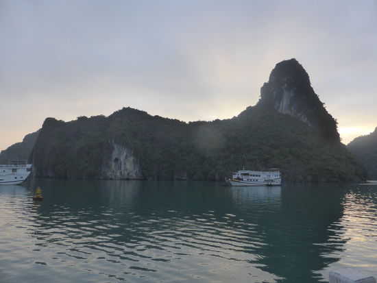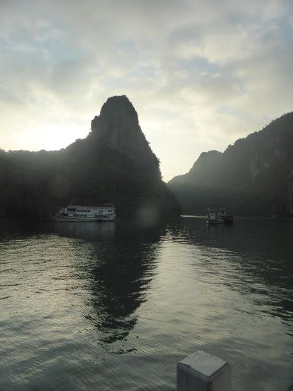 Ulrike hat die schwächelnde Klimaanlage auch noch ausgemacht in unserer tollen Kabine, so dass ich den ersten Teil der Nacht der Hitze wegen nicht ruhig schlafen kann, nehme ich die Decke weg, wird mir kalt, lege das Tuch über mich fange ich an zu schwitzen – hat das etwas mit Fieber zu tun? Ich nehme einfach sicherheitshalber ein Paracetamol und schlafe tatsächlich ein. Am Morgen als ich wach werde, ist es noch sehr dunstig, wegen eines möglichen Sonnenaufganges stehe ich eine halbe Stunde vor dem Wecker auf, mache mir einen Kaffee und beobachte die Helligkeit hinter den Bergen. Ulrike wird auch wach und benötigt auch einen Kaffee, da ihr der aromatisierte nicht gefällt.