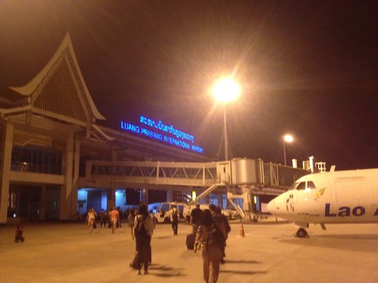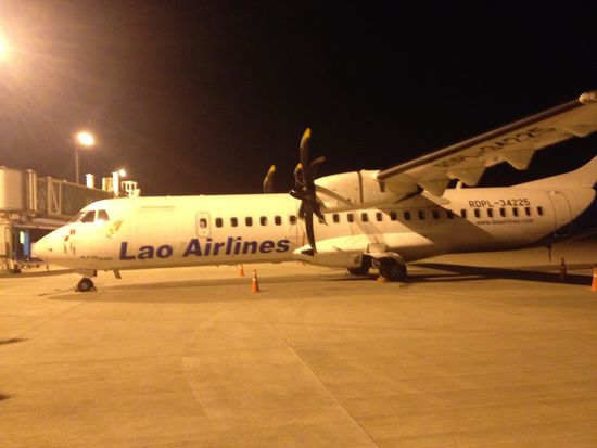 Am Flughafen checkt der Guide für uns ein, und dann sind wir ausnahmsweise mal allein. In der Wartezeit nutze ich das freie WLAN um vergessene Mails und Whats Apps zu schicken. Die Laos Airline Maschine ist eine Turbo-Prop des Typs ATR 72-500, die rasant geflogen wird, sowohl die Kurven beim ‚taxing’ als auch nachher bei der Landung, das Aufsetzen geschieht mit Brachialgewalt.
