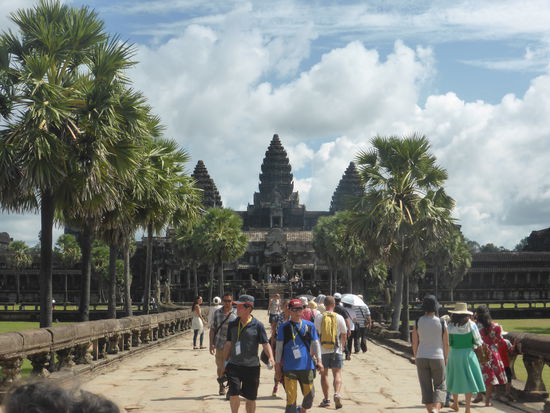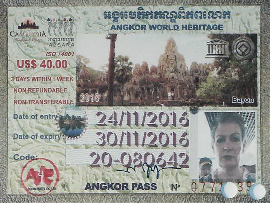 Treffpunkt ist 8.00 Uhr an der Rezeption. Mit unserem Toyota Camry werden wir sodann direkt zum Ticketoffice für Angkor Wat gebracht. Der ganze Terminal – hoch modern in asiatischem Stil erstellt – ist voller Busse und, Tuktuks. Mr. Sen erklärt uns, dass wir mitkommen müssen, einzeln treten wir vor den Spezialschalter ohne Warteschlange und werden mit einer modernen Desktopkamera fotografiert. Wenige Augenblicke später spuckt ein Drucker einen Wochenpass mit Konterfei zu 40$ aus. Dann geht es an einen der zahlreichen Eingänge.