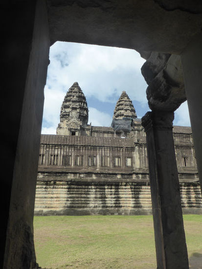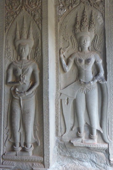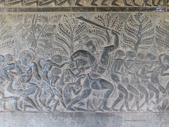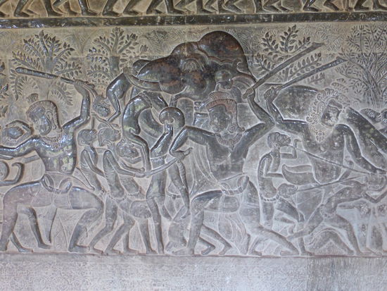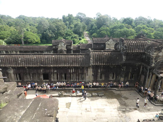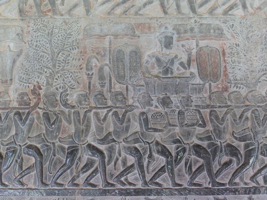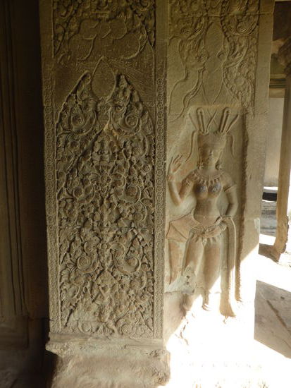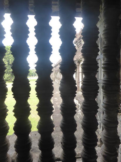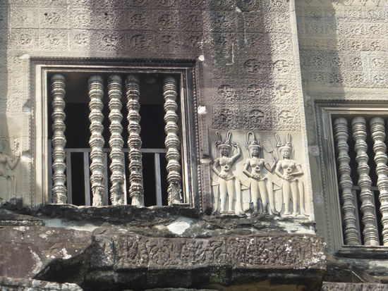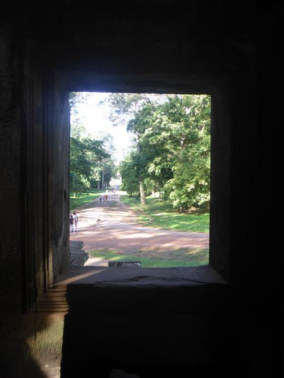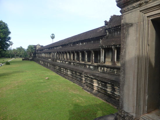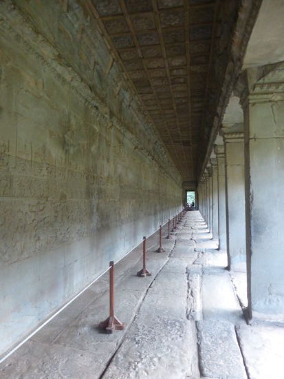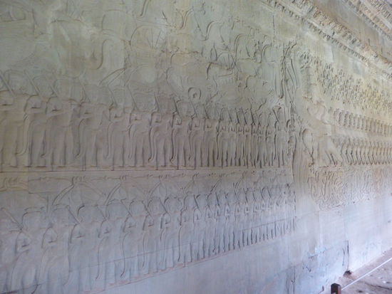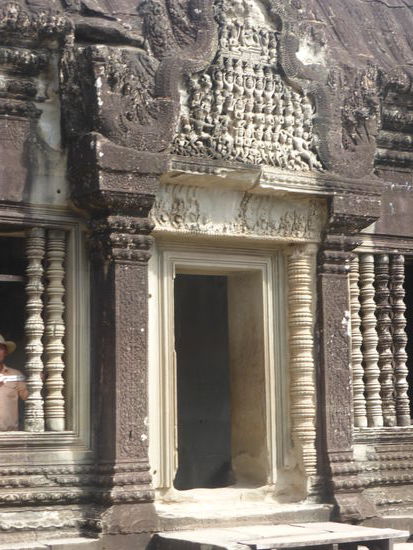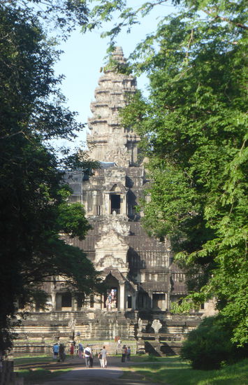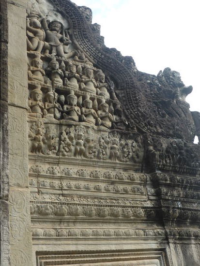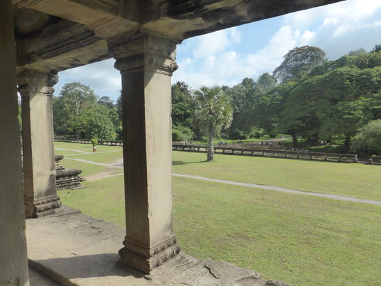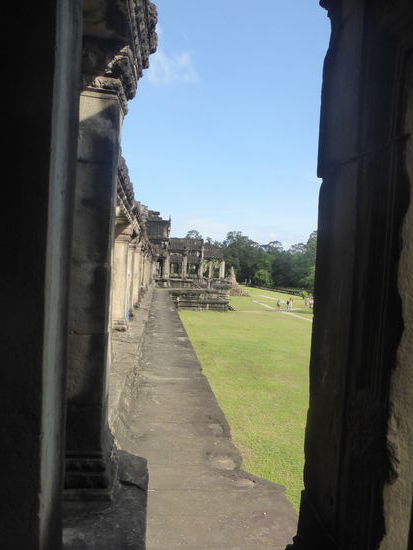 Davor mähen Arbeiter das Gras mit der Sichel im Hocken. Die ersten beeindruckenden Flachreliefs tauchen auf. Wir betreten das Tor durch einen Seiteneingang, um auch die fugenlose Konstruktion zu sehen: außerdem meint Mr. Sen von hier wäre der beste Blick auf Angkor Wat und recht hat er, denn durch die lange Baumallee ist der hohe Bayan frei zu sehen.