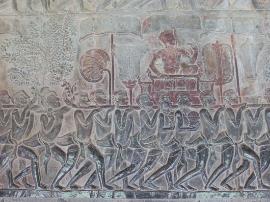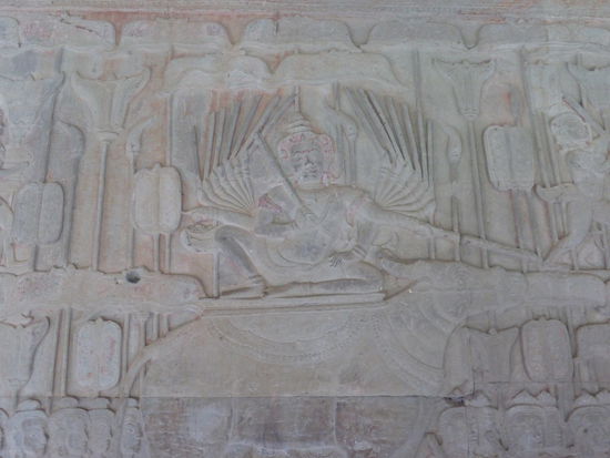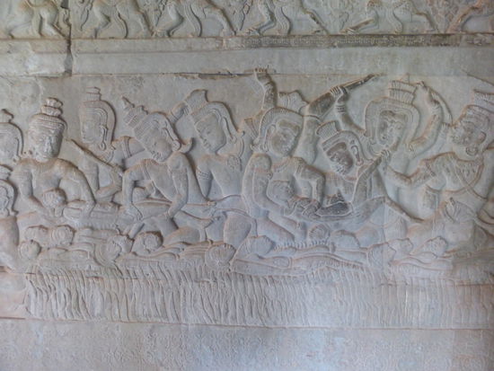 Insgesamt acht Flachreliefgalerien umgeben den Tempel, jeweils eine links und rechts von den zentralen Eingängen auf den vier Seiten. Die Szenen der Reliefs haben jeweils ein bestimmtes Thema. Wir halten uns an der Südseite lange Zeit auf, da Mr. Sen zahlreiche Bilder genau erklärt.