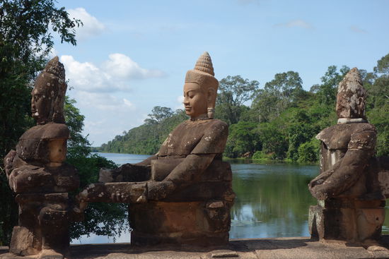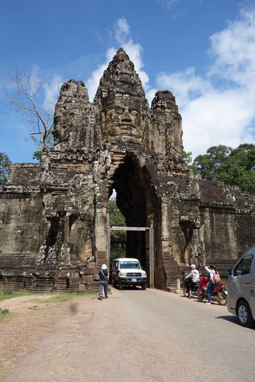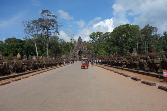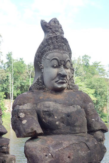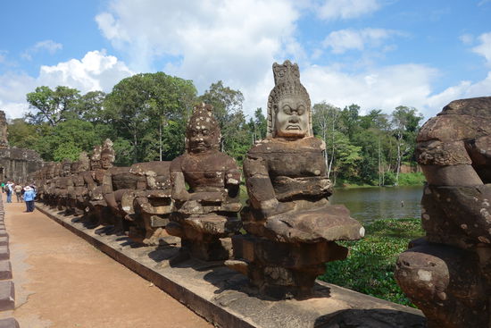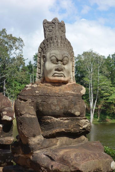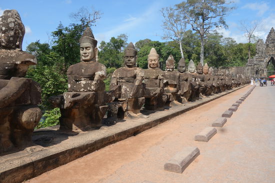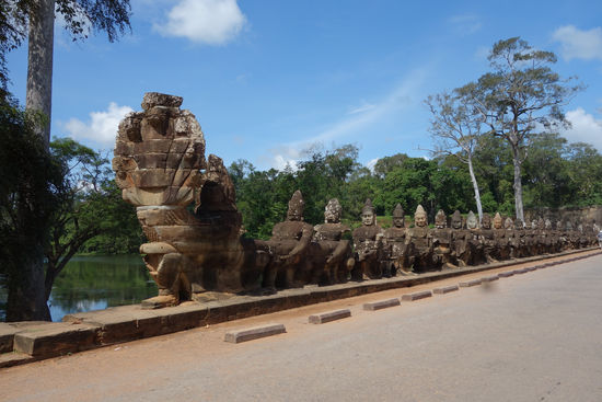 5 min Fahrt bringen uns dann zum Angkor Thomm. Eine Brücke vor dem Eingangstor ist gesäumt von zahlreichen Skulpturen, auf der linken Seite lauter Figuren mit freundlichen Gesichtern – manchmal auch ohne Kopf, oder total verwittert oder gar neu – dies sind die Götter . Auf der gegenüberliegenden Seite befinden sich die Dämonen mit z.T. furchterregenden Fratzen.