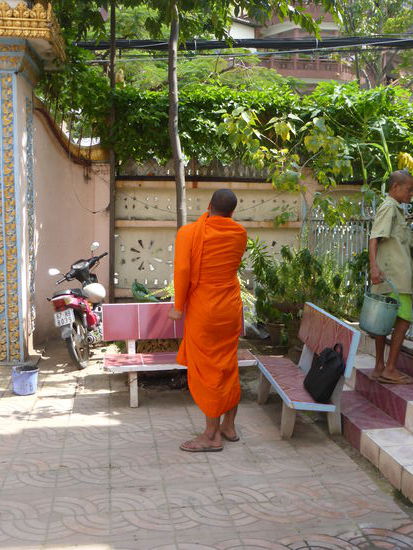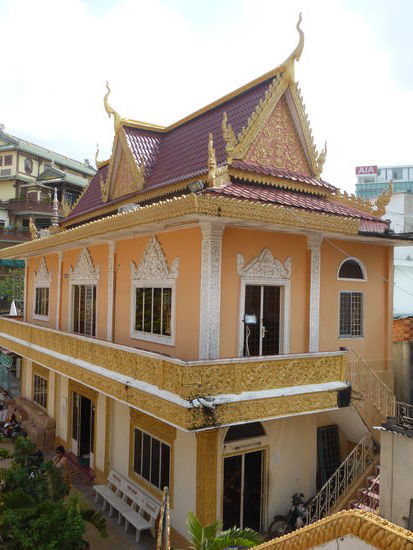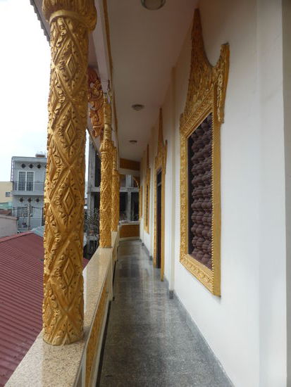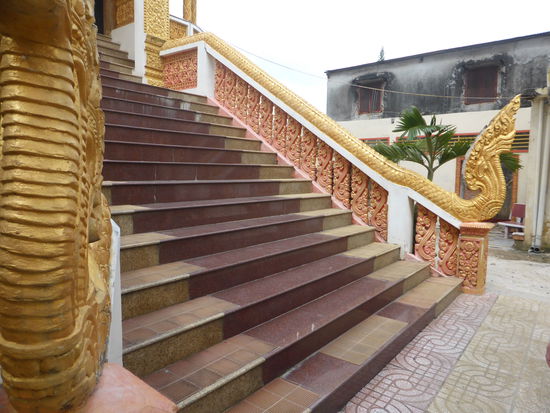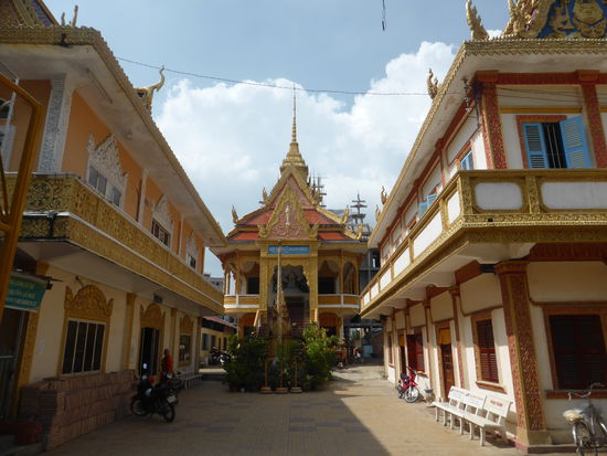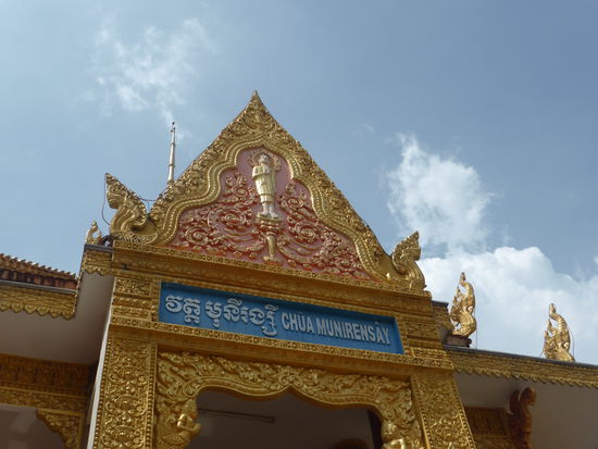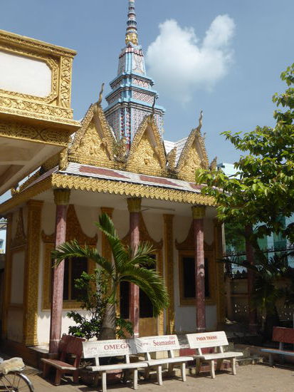 Zwei Tempel liegen an der Hauptstrasse direkt gegenüber, am ersten kommt uns leider eine Kleingruppe zuvor, aber die haben es wohl eiliger als wir. Der Chua Muniransay wird z. ZT. wieder einmal erweitert. Der Khmertempel ist erkennbar an der steilen von Drachen flankierten Treppe. (Unterscheidungsmerkmal zu den vietnamesischen Tempel). Die Anlage dient seit 1946 einer kleinen Gemeinde Can Thos mit etwa 3000 Gläubigern; in ihr leben noch Mönche.