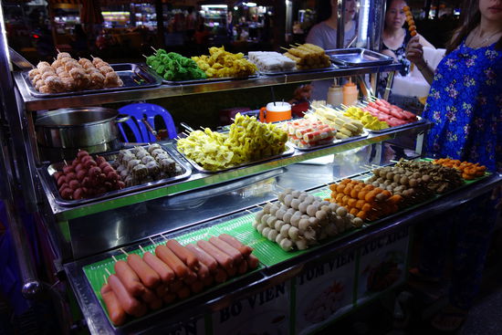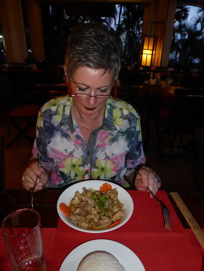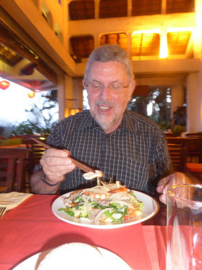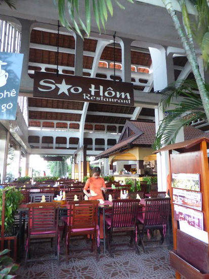 Am Flussufer ist ein hübscher Park mit einem Ho Chi Minh Denkmal angelegt. , an dessen Ende dann auch die alte Markthalle liegt, in der das Sao Hom liegt, das uns Mr. Hung als Restaurant empfohlen hat. Wir bekommen keinen Exklusiv-Platz , da wir nicht reserviert haben – noch eine Falschmeldung von Mr. Hung. Es ist wohl doch schon Saison. Das Essen ist sehr lecker. Ulrike ißt Huhn mit Lemongras und Reis, ich weiche Nudeln mit Meat und Seafood (shrimps) und einer tollen Gemüsemischung. Wir sind beide satt! Und das für 140000 bzw. 100000 VND – auch das Saigonbier ist mit 35000 VND nicht zu teuer. Meine Frau Ulrike wählt heute allerdings einen franz. Weißwein. (Gut, 100000 VND per Glas)