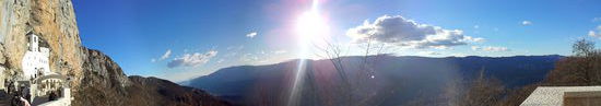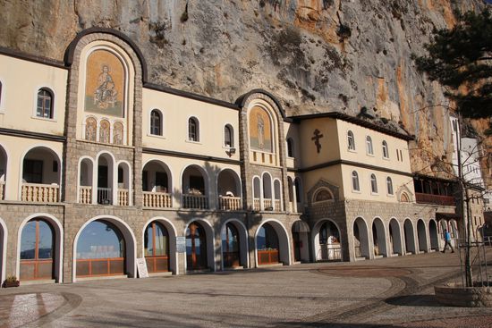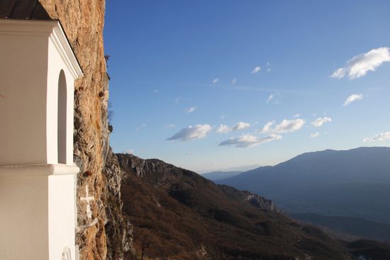 Das Kloster ist in eine fast senkrechten Felswand des Berges Ostroska eda in 900m Höhe über dem Meeresspiegel eingemeißelt. Von hier aus kann man die spektakuläre Aussicht auf die Ebene Bjelopavlici genießen.