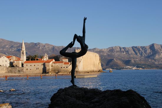 Nach der Stärkung ging es dann an den Felsen entlang zum Strand Mogren vorbei an der Statue der Ballerina Tänzerin.