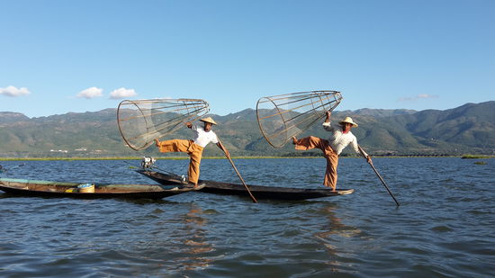 Die berühmten Einbeinruderer des Inle Sees sieht man ohne große Mühe recht schnell. Das Ruder wird mit einem Bein eingeklemmt und dann in kreisenden Bewegungen gerudert, während der Fischer die Hände zum Fischen frei hat.