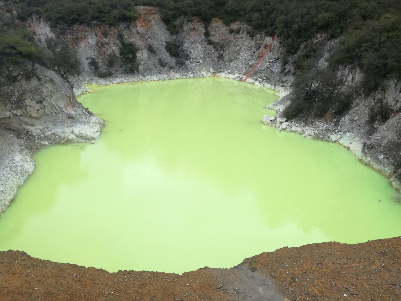 Nach dem Mittagessen sind wir zum Wai-O-Tapu Thermal Wonderland gefahren. Auf einem drei Kilometer langen Rundweg sieht man wie durch Krater heißer Schwefeldampf aufsteigt und entdeckt viele Seen mit unterschiedlichen Farben. Der Geruch ist schon etwas eklig, aber für ein Mitglied von ructus flatus nichts außergewöhnliches. Melina ist teilweise mit einer Wäscheklammer auf der Nase rumgelaufen.