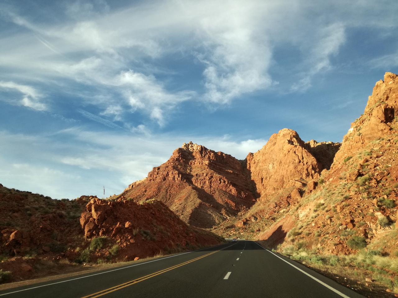 Es war nun schon nachmittags und wir hatten noch eine dreistündige Fahrt vor uns. Zuerst müssen wir wieder zurück nach Flagstaff und dann weiter nach Norden. Irgendwann fahren wir parallel zu den Vermilion Cliffs, einer tiefrot gefärbten Bergkette durch recht unbewohntes Navajo-Land.
