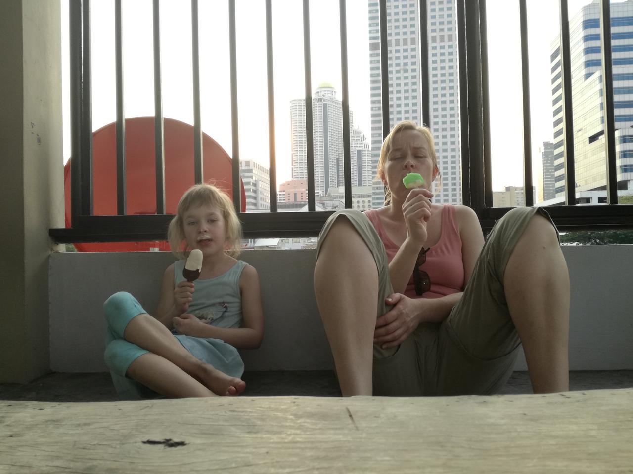 Entspannung nach der anstrengenden Tour. Ein Eis auf der Dachterasse vom Hostel. Im Hintergrund das Hotel aus Hangover.