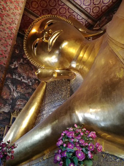Unsere Tour startete mit einer Bootsfahrt zu einem Blumen- und Gewürzmarkt. Nach einer kleinen Stärkung haben wir uns den liegenden Buddha, Wat Pho, angesehen. Die Figur ist 15m hoch und 46m lang, sehr beeindruckend. Während der Tour, die wir vor einiger Zeit bereits gebucht hatten, haben wir viel über den Glauben und die Mönche gelernt. Auch die unterschiedlichen Details, wie zum Beispiel die Haltung der Hände der thailändischen Buddha Statuen wurden erklärt.