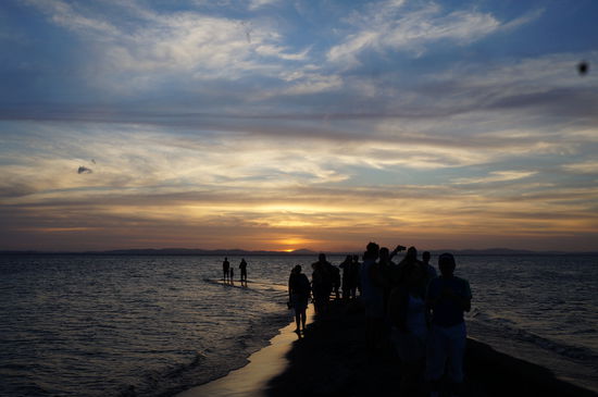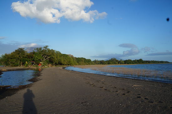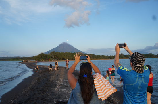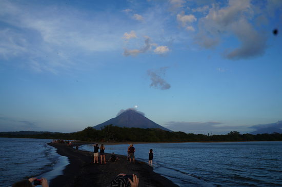 Um 9 geht es dann mit unserer Tour los. Es wird noch ein englischsprachiger Guide organisiert und dann starten wir. In dem alten klapprigen Bus geht es dann auf eine Inseltour mit vier Stationen. Laguna Choco Verde ist der erste Halt. Hier gibt es mariposas (Schmetterlinge) in allen Farben, Brüllaffen, Schlangen und große Leguane zu sehen. Unser Guide ist nicht sehr gesprächig, dafür aber sympathisch. Er bringt sich Englisch selber bei und spricht schon recht gut, aber vielleicht noch nicht gewandt genug, um den stetigen Entertainer zu spielen. Aber die Natur spricht für sich. Dann besichtigen wir eine 6000 Jahre alte Steinmalerei der Mayas! Die dann auch wohl in Nicaragua waren. Sie gaben Ometepe (2 Vulkane) den Namen und haben sich in den Steinen verewigt. Unser Guide streicht liebevoll über den antiken Stein. Mein Gefühl sagt mir, dass die antike Zeichnung der Mayas immer mal wieder aufgefrischt wird. Aber egal, es gefällt uns. Zum Relaxen geht es mit dem Runpelbus dann zu einer Art Schwimmbad, das von natürlichen Quellen getränkt wird. Baden und Nica Libre ... so lässt sich das schon aushalten. Zum späten Nachmittag geht es zum Sunset nach Jesus Maria, so heißt die kleine Landzunge. Es ist ein Licht- und Naturspektakel. Während die Sonne auf der einen Sonne langsam untergeht, wechseln die malerischen Vulkane, die von der Sonne angestrahlt werden, fast minütlich ihr Antlitz. Die Wolken über dem Vulkan ändern sich, das Licht ändert sich. Wir teilen unser Glück mit einigen anderen, die wie wir die Gigabytes Ihrer Speicherkarten beim Fotografieren voll ausnutzen. Als sich dann noch der Mond über den Vulkangipfel zeigt wird es schon fast kitschig.