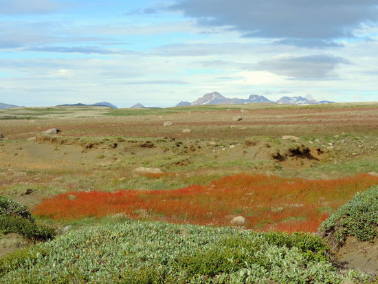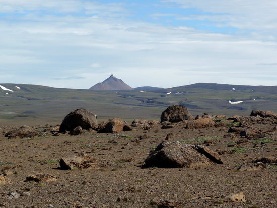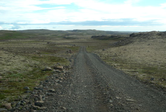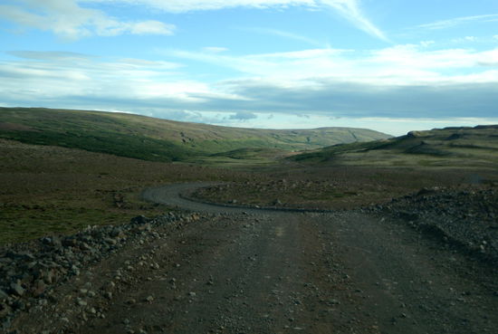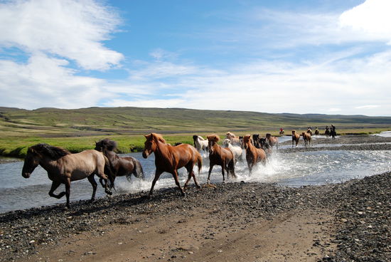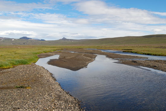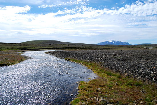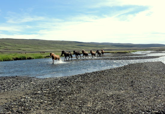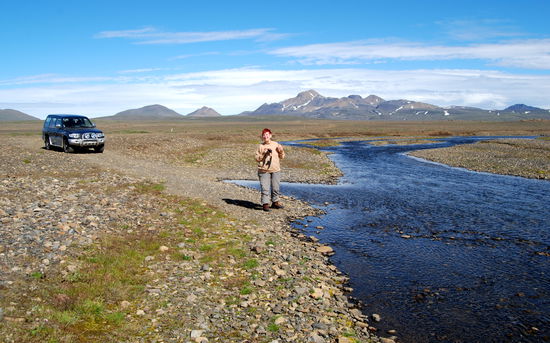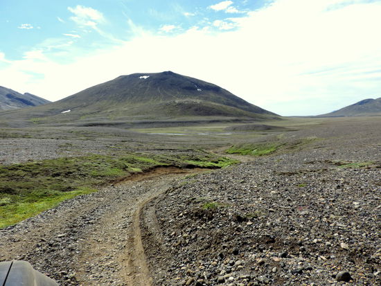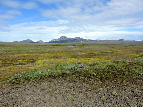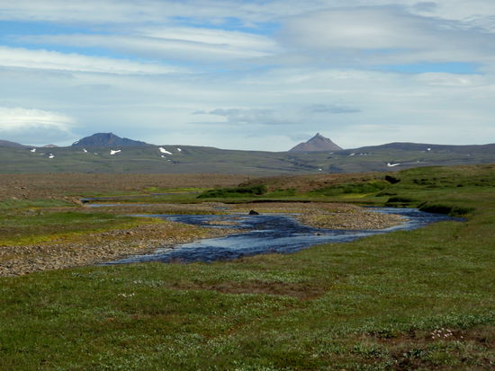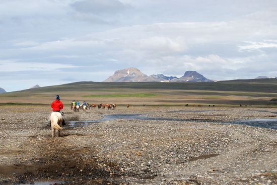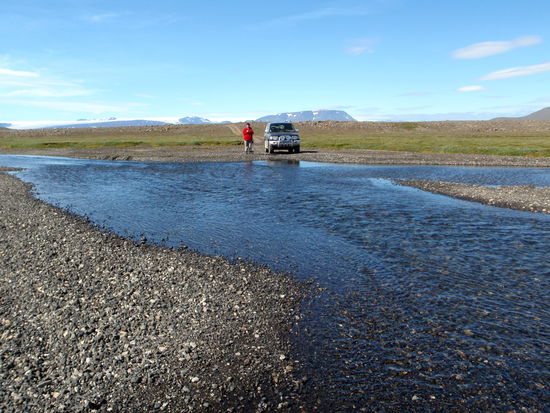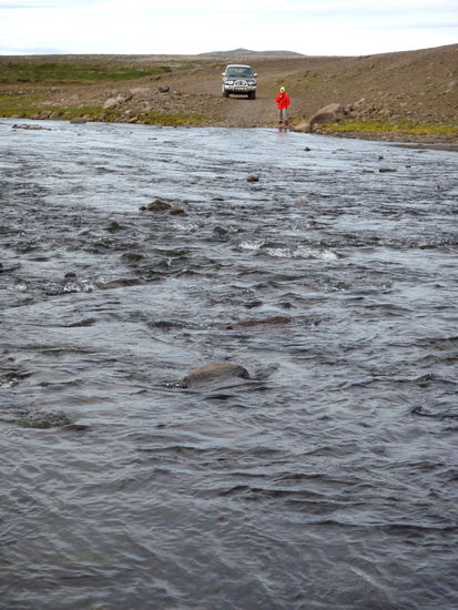 Der Rat war prima. Die Strecke war so abwechselungsreich, wie man es sich kaum vorstellen konnte. Mal ging es durch riesige ebene Flächen, wie graue Wüsten, in der Ferne von hohen Bergen begleitet, dann wieder durch schwarze Lavafelder. In der Ferne war der Langjökull und, je nach Fahrtrichtung, Kerlingarfjöll mit dem Hofsjökull zu sehen. Dann ging es hinab in ein breites Flußtal. Die erste Vadställe war nur klein. Rainer ging sie aber trotzdem, wie alle anderen, in der Wathose ab. Dann kamen wir an eine Stelle, die sehr reißend war. Rainer beseitigte noch einen größeren Stein, der eventuell Probleme gemacht hätte, dann fuhren wir vorsichtig hindurch, um kurz darauf festzustellen, daß dieser Weg nur zu einer Hütte führte. Also zurück und die richtige Stelle suchen. Wir fuhren ein Stück durch den Schotter des Flußbettes. Gerade als wir die richtige Furt erkunden wollten, kam uns eine große Reitergruppe entgegen, ein tolles Bild. Die Pferde zeigten uns den besten Weg durch das Wasser. Die Piste führte nun eine ganze Weile durch ein grünes Tal mit vielen kleinen Blumen, und auch die Berghänge waren zart grün. Dann ging es wieder hinauf in die Berge.