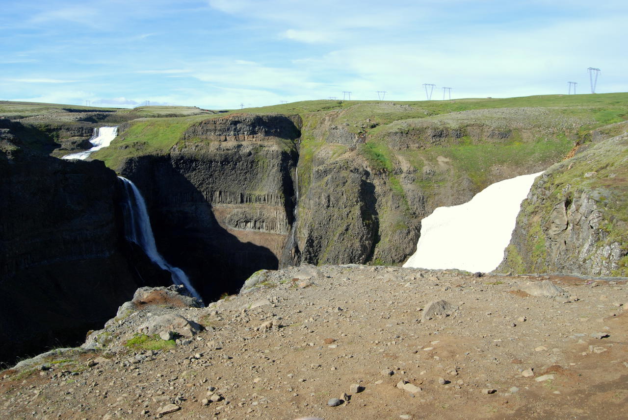 Wir hielten uns an die Empfehlung und fuhren zuerst nach Geysir. Mit vielen Touristen gingen wir zum Strokkur, der in regelmäßigen Abständen seine heiße Wasserfontäne auswirft. Wir machten noch einen Rundgang durch den riesigen Andenkenladen. Anschließend tankten wir noch einmal voll und fuhren die asphaltierten Straßen 35 und 31 entlang. Wir kamen gut voran, bogen kurz auf die 30 und gleich darauf auf die 32 ab. An einer Tankstelle machten wir noch einmal Rast und wuschen auch das Auto. Weiter ging es durch das malerische Tal der þjórsá. Immer wieder gab es schöne Ausblicke auf die Hekla. Wir wollten aber noch einen Abstecher zum Hájfoss machen. Eine Allradpiste führte steil hinauf, ein tolles Erlebnis. Der Wasserfall war beeindruckend, eigentlich sind es mehrere. Hier gibt es aber überall eine Menge Überlandleitungen. Im Tal wurden einige Stauseen und Umspannwerke gebaut. Auf der Weiterfahrt kam noch eine Tankstelle, wir tankten noch einmal voll, besser ist besser. Dann ging es auf die Piste F208. Hier war ganz schön was los, uns kamen viele Fahrzeuge entgegen. Die Landschaft war einfach toll. Es ging bergauf und bergab, um Vulkankegel herum. Zeitweise fuhren wir auch über gradlinige Wellblechpisten durch schwarze Wüsten. Schon in Sichtweite des Campingplatzes gab es noch eine große Doppel-Vadställe zu durchfahren. Auf dem Campingplatz Landmannalaugar angekommen war es gar nicht so leicht einen Stellplatz zu finden. Wir hatten die Wahl: Matsch oder Geröll. Wir planierten uns eine Fläche und bauten das Zelt auf. Als ich Gepäck vom Auto holte, fiel ich über eine Leine, die den Zeltplatz abgrenzte, auf schöne spitze Steine. So ein Mist! Zwar hatte die Hose das meiste abgehalten, aber Knie und Schienbein taten tüchtig weh. Was soll´s, die Sonne schien auf die Berge, und sie sahen wunderschön aus.